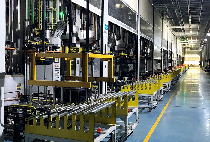 在這個(gè)“黑燈車間”——通用股份乘用胎工廠硫化車間生產(chǎn)線上,生產(chǎn)主力不再是工人,取而代之的是機(jī)械手臂、EMS小車、堆垛機(jī)、全自動(dòng)硫化機(jī)等等,它們?cè)跓o(wú)照明的條件下,為200多個(gè)規(guī)格型號(hào)的6000多條胎胚同時(shí)進(jìn)行自動(dòng)硫化作業(yè),實(shí)現(xiàn)24小時(shí)不間斷生產(chǎn)。2019年,該車間還被評(píng)為無(wú)錫市智能車間。