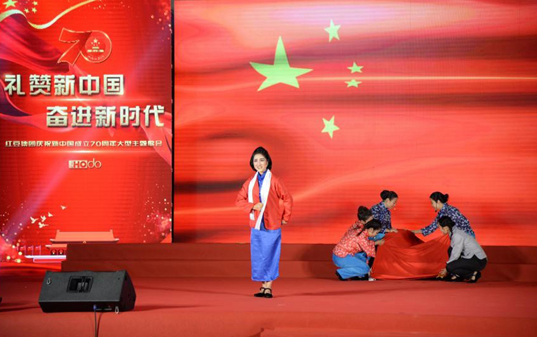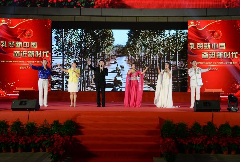 “我愛你中國,我愛你中國,我要把美好的青春獻(xiàn)給你,我的母親,我的祖國……”9月29日晚,由紅豆集團(tuán)主辦的“禮贊新中國 奮進(jìn)新時代”——慶祝新中國成立70周年大型主題歌會在東港紅豆萬花城圓滿舉行。由紅豆集團(tuán)“先進(jìn)黨員”、“先進(jìn)勞模”代表與合唱團(tuán),一同合唱的歌曲《我愛你,中國》拉開了歌會的序幕。整場主題歌會以歌曲聯(lián)唱、大合唱、經(jīng)典片段演繹及配樂朗誦等多種形式,歌唱祖國,慶祝新中國70華誕。歌會濃濃的愛國情懷感染了現(xiàn)場每一位觀眾。