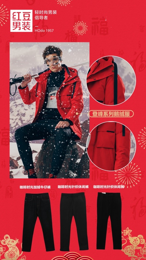 紅色代表著喜慶、吉祥和幸福,也包含著對新的一年美好的祝愿,過年在穿著中加點紅色成為一種約定俗成的傳統(tǒng)。紅豆男裝登峰系列中的紅色鵝絨服突破了秋冬里一貫的沉悶色調(diào),為整體刻畫出鮮艷活潑的造型,內(nèi)搭印花衛(wèi)衣或毛衫,下裝選擇黑色或者藏青色深色系的休閑褲,中和了紅色的跳脫。穿上這一身走親訪友,為許久不見的長輩帶去新年的問候與祝福。