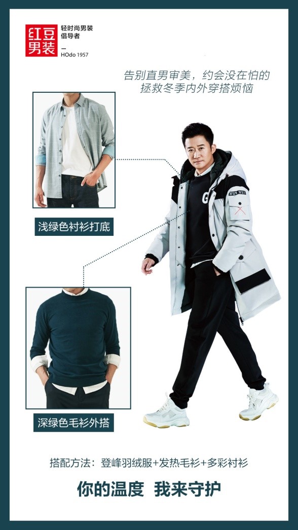 春節(jié)期間除了享受家人團(tuán)聚的熱鬧,還少不了和三兩個好友知己的約會聚餐,聊聊生活和工作,放下包袱與重?fù)?dān),只要相聚在一起,快樂就能無限延伸。在穿搭上可以選擇充滿時尚感和科技感的吳京同款紅豆登峰鵝絨服,淺綠色襯衫做打底,增加了整體搭配的質(zhì)感,中間增加了深綠色毛衫,不僅更保暖,也起到了增加層次感和色彩過渡的作用。整體造型時尚休閑又不失品味,是適合和朋友聚會的穿搭。