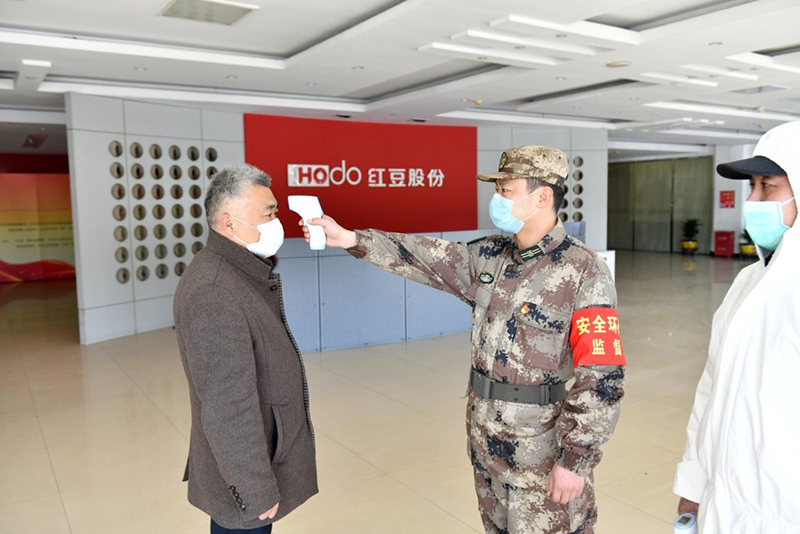謝軍,是這次紅豆防護(hù)服生產(chǎn)大樓的安全生產(chǎn)負(fù)責(zé)人,也是一名退役軍人,他每天都要對(duì)進(jìn)入大樓的員工進(jìn)行排查,檢測(cè)好生產(chǎn)工人的體溫。每天早晨7點(diǎn),他已站在大樓門口,面對(duì)陸陸續(xù)續(xù)來上班的員工,謝軍和同事一起為每位準(zhǔn)備進(jìn)入的員工進(jìn)行體溫測(cè)量。從大年初二至今,謝軍便以廠為家,連續(xù)多日開展疫情防控工作,未曾回過家。近幾日,低于零下的冬季清晨,伴著刺骨的寒風(fēng),讓人忍不住打冷顫。