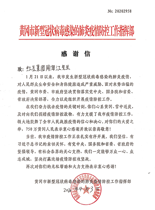 近日,湖北省“黃岡市疫情防控工作指揮部”給紅豆集團(tuán)黨委書記、董事局主席兼CEO周海江發(fā)來(lái)感謝信,信中說(shuō),“在我們奮力抗擊疫情的關(guān)鍵時(shí)刻,你們心系黃岡、雪中送炭,及時(shí)向我們捐贈(zèng)疫情防控款物,有力支援了我市疫情防控工作,極大地鼓舞了全市人民戰(zhàn)勝疫情的信心和決心。對(duì)你們的大愛(ài)之舉,750萬(wàn)黃岡人民表示衷心感謝并致以崇高敬意!”