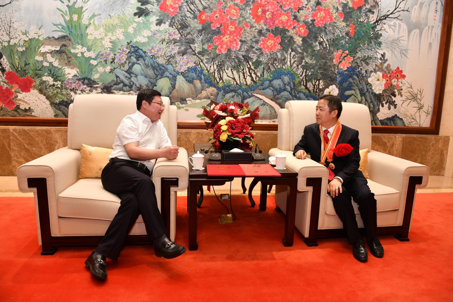 一見面,周文棟就高興地說,我代表錫山區(qū)四套班子,還有70萬錫山的老百姓歡迎周海江凱旋歸來。周海江獲得的兩項殊榮,不僅是個人的榮譽,紅豆的榮譽,還是我們整個錫山,還有無錫人民的巨大榮譽,是我們錫山區(qū)、無錫市的驕傲??梢哉f,周海江和紅豆集團獲得了黨建工作榮譽(全國先進基層黨組織、全國優(yōu)秀黨務工作者、全國優(yōu)秀共產(chǎn)黨員)的大滿貫。周海江十分感謝市區(qū)黨政班子的關心和支持。他說,此次全國抗擊新冠肺炎疫情表彰大會的儀式感很強,正如我們在視頻中所看到的鐘南山院士由國賓護衛(wèi)隊護衛(wèi)前往人民大會堂這是歷史第一次,勛章是由禮儀兵護送上去。我覺得黨中央是想通過此次活動把我們民族精神賦予新的內(nèi)涵,即增加了抗疫精神,把抗疫的強大精神力量轉(zhuǎn)化為我們戰(zhàn)勝中美貿(mào)易戰(zhàn)等各種挑戰(zhàn)的力量源泉。周海江還表示,要化這種受激勵的奮進力量為推動紅豆轉(zhuǎn)型發(fā)展的動力。要努力把紅豆的工作做好,把企業(yè)經(jīng)營好,加快進化升級,不負黨委、政府和人民的期望。周文棟表示,感同身受周海江參會氛圍的感染和偉大抗疫精神的力量傳遞,希望這種奮進的力量也能成為我們錫山“做全市重要增長極,當改革創(chuàng)新先行軍”的動力源!