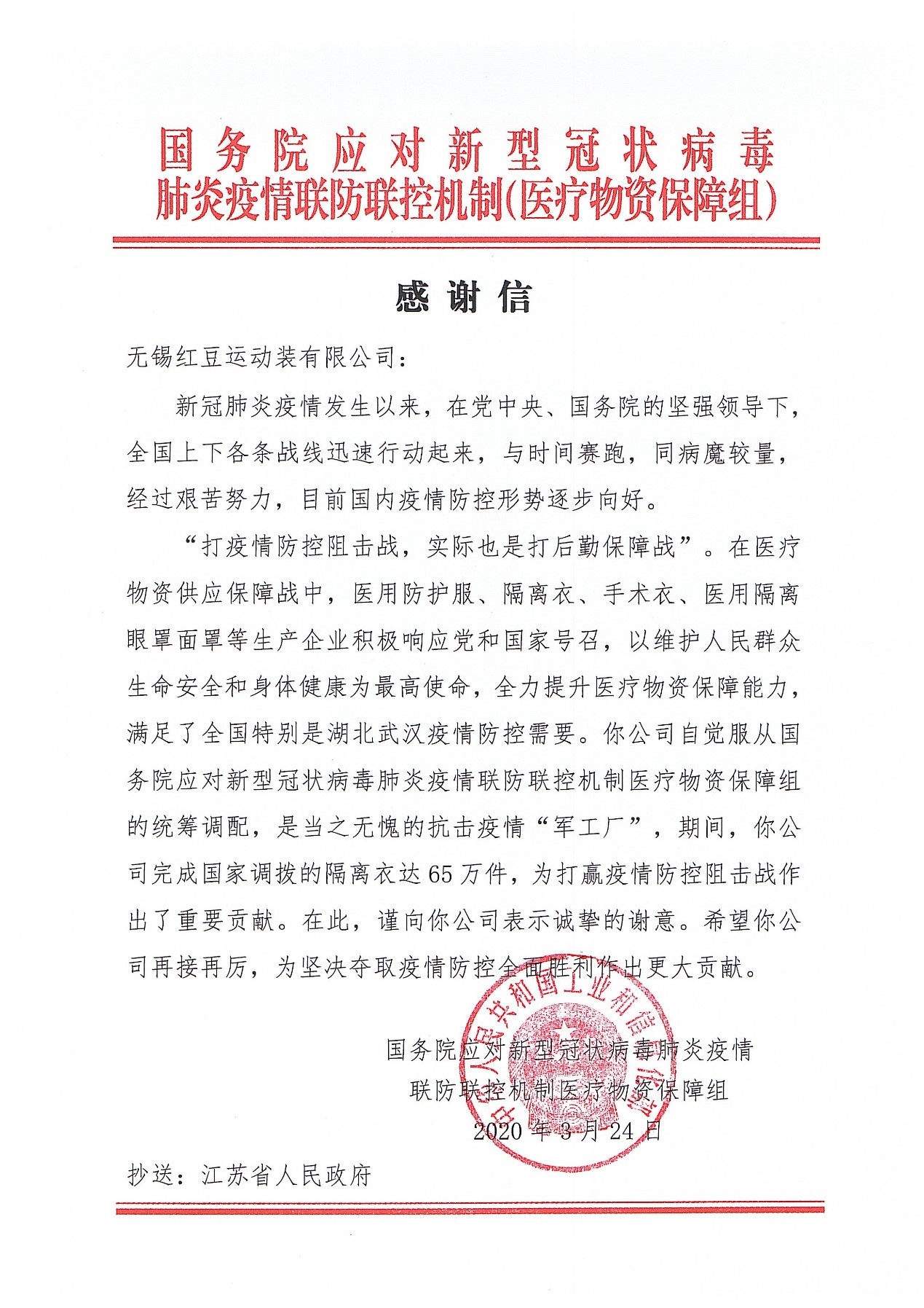 因?yàn)榧t豆在抗擊疫情中作出的貢獻(xiàn),國(guó)務(wù)院應(yīng)對(duì)新型冠狀病毒肺炎疫情聯(lián)防聯(lián)控機(jī)制(醫(yī)療物資保障組)給紅豆發(fā)來感謝信,稱贊紅豆為抗擊疫情當(dāng)之無(wú)愧的“軍工廠”。9月8日,在全國(guó)抗擊新冠肺炎疫情表彰大會(huì)上,周海江榮獲 “全國(guó)抗擊新冠肺炎疫情先進(jìn)個(gè)人”“全國(guó)優(yōu)秀共產(chǎn)黨員”兩項(xiàng)殊榮,是同時(shí)獲得兩項(xiàng)殊榮的唯一民營(yíng)企業(yè)家。